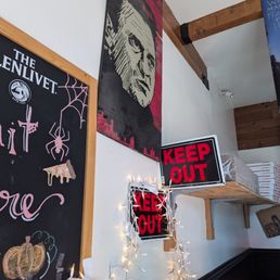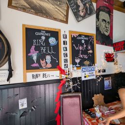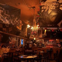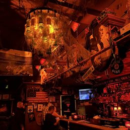 I adore this bar! We walked in and saw a Dolly Parton poster and knew this is our kind of joint. Chandeliers with fake cob webs (or real- no judgment), Johnny cash , and Willy wonka on the tv. This place is the perfect amount of oddities ! The bartenders are amazing conversationalists , the pizza and knots we ordered were phenomenal . I will easily go back to this dark bar in a heartbeat !!!